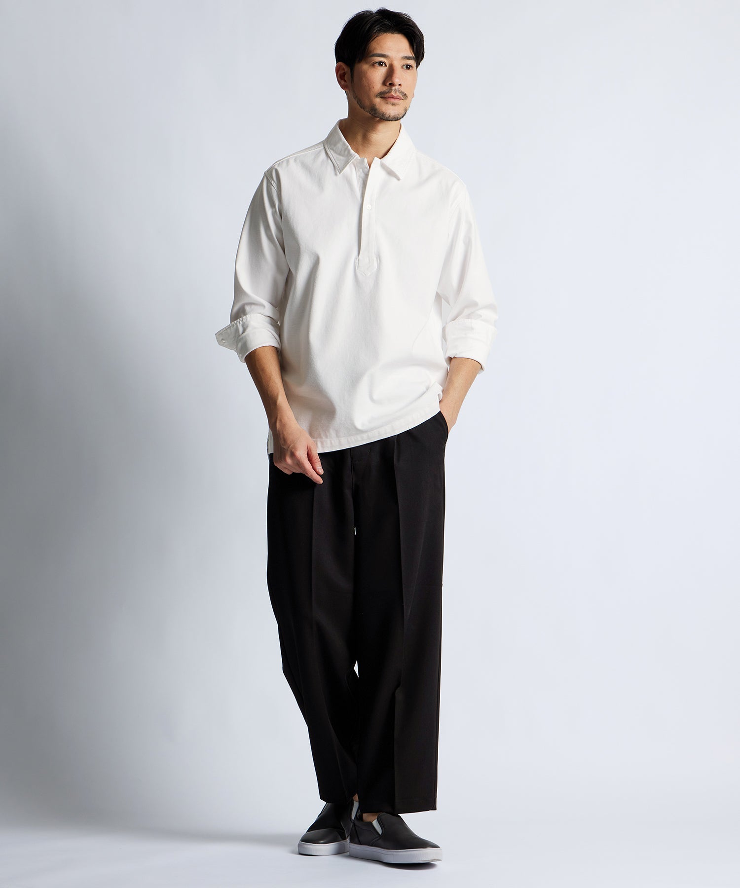 シャツのきちんと感を残しながらも、程よくラフな印象に仕上げています。