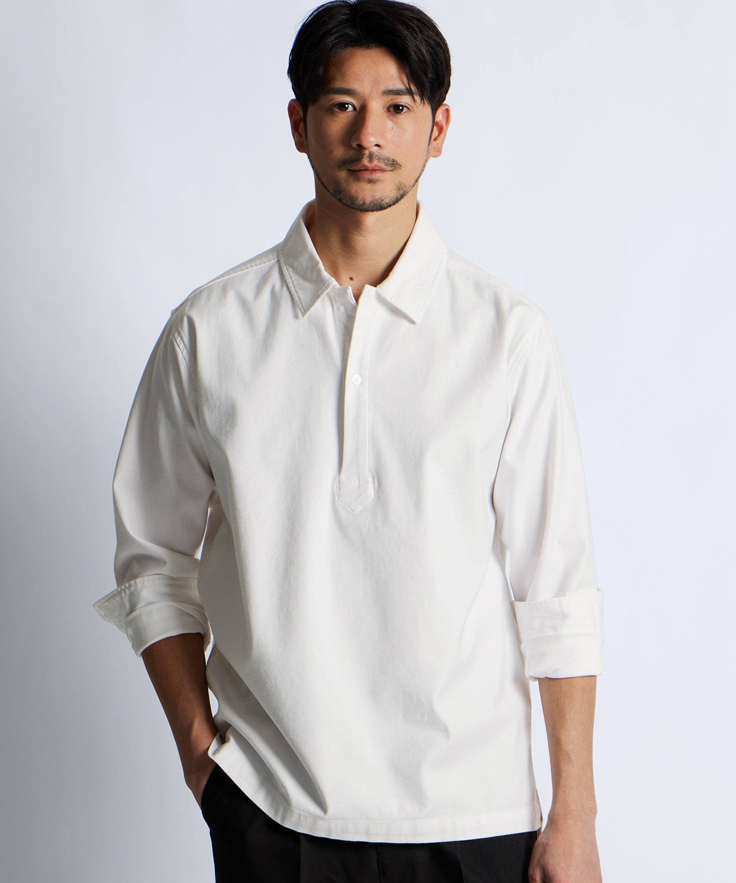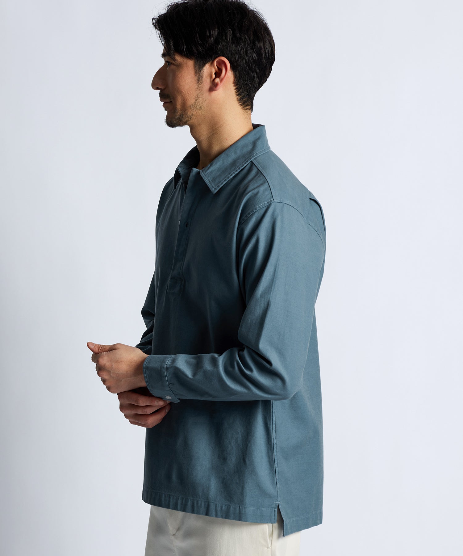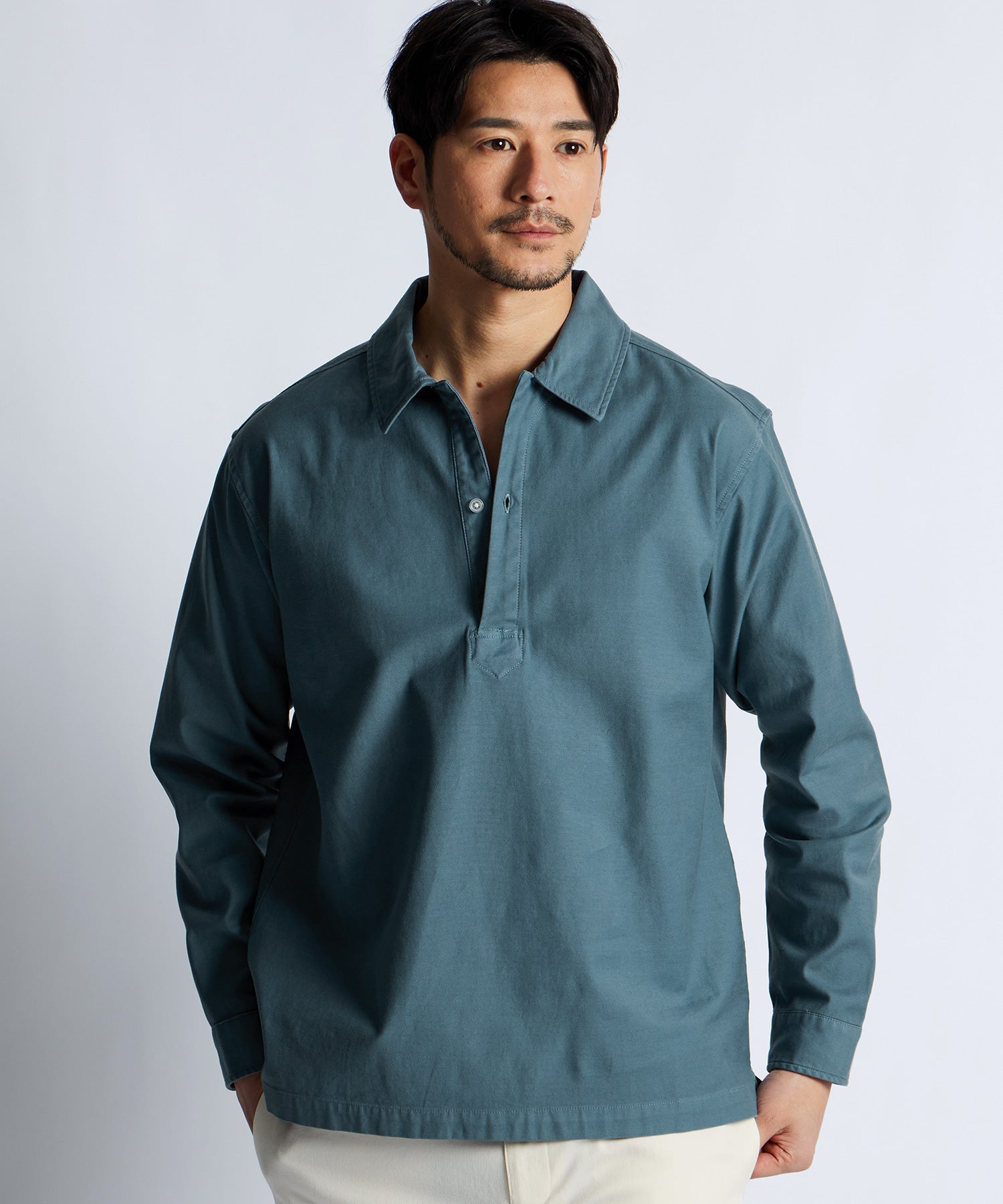 フロントのボタンを胸元あたりまでに設定した、かぶりで着用するプルオーバータイプのシャツ。